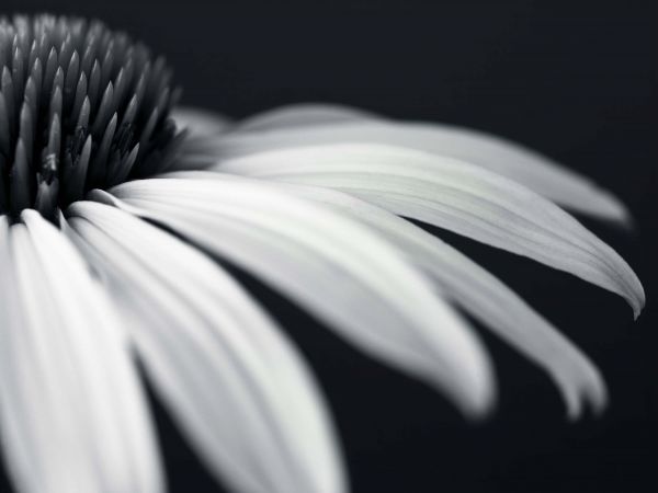 Die Sonnenblume, auch Echinacea genannt, in Schwarz und Weiß. Kombinieren Sie diese Nahaufnahme in Ihrem Haus.