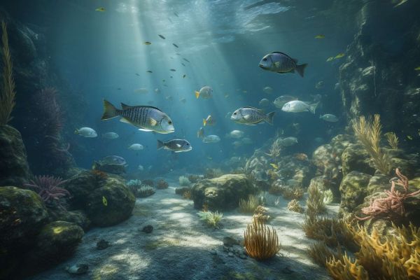 Eine serene Unterwasserwelt entfaltet sich, in der das Sonnenlicht sanft durch das klare Wasser fällt und die vielfältigen Meeresbewohner hervorhebt. Die beruhigende Harmonie zwischen blühendem Korallen und schwimmenden Fischen bildet eine natürliche Symphonie aus Farben und Leben.