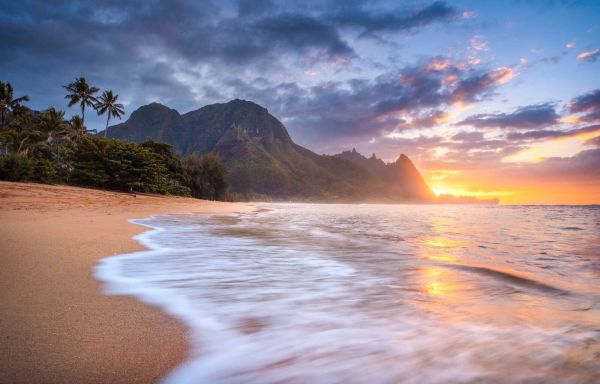 Ein farbenfroher Sonnenuntergang spiegelt sich in den Wellen entlang eines tropischen Strandes, umgeben von Palmen und üppigen Bergen. Das warme Licht und die ruhige Brandung schaffen eine träumerische und entspannte Atmosphäre.