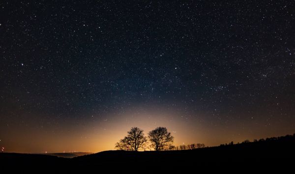 Der Himmel voller Sterne über der Wiese mit ein paar Bäumen im Hintergrund.