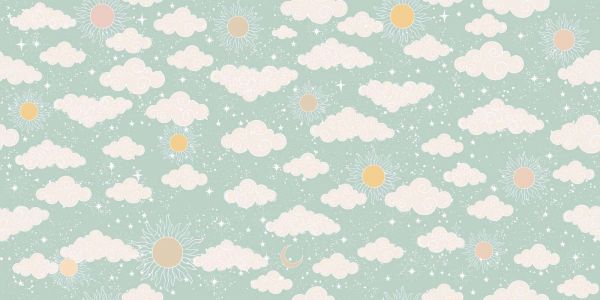 Ein verspieltes Himmelmuster mit zarten Wölkchen, Sonnen, Monden und funkelnden Sternen in Pastelltönen auf einem mintgrünen Hintergrund. Das Design vermittelt Ruhe, Freundlichkeit und Vorstellungskraft.