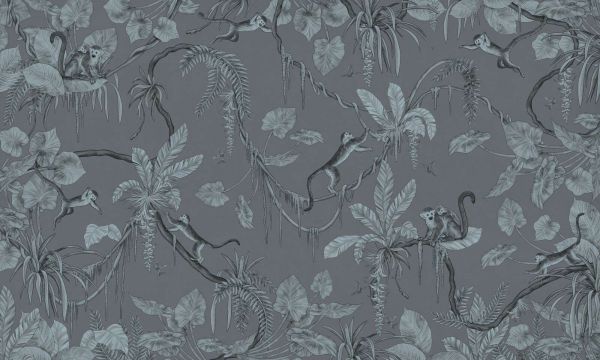 Affen schwingen durch eine üppige Tropenlandschaft, gezeichnet in stilvollen blaugrauen Tönen. Der ruhige Hintergrund und die gedämpften Farben verleihen dem Design eine ruhige, elegante Dschungelatmosphäre mit verspielten Details.