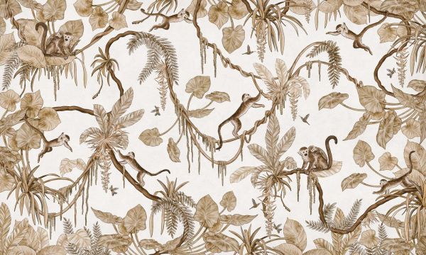 Zwischen tropischen Blättern und hängenden Lianen spielen Affen in einem warmen Dschungelbild. Der helle Hintergrund und die natürlichen Brauntöne verleihen dem Design eine frische, freundliche Ausstrahlung mit klassischem Charme.