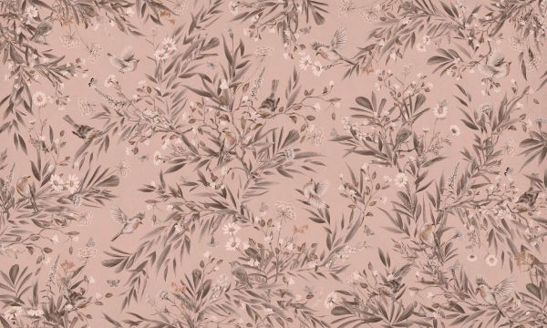 Zarte Vögel flattern zwischen Blumen und Zweigen auf einem warmen altrosa Hintergrund. Die sanften Erdtöne verleihen diesem Muster eine träumerische, klassische und romantische Ausstrahlung mit natürlicher Eleganz.