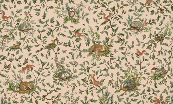 Ein bezaubernder Wald voller Leben und Ruhe entfaltet sich vor einem sanften beigen Hintergrund. Zwischen anmutigen Eichenzweigen und Eicheln nisten sich verschiedene Tiere ein: schlafende Kaninchen in Moesnestern, fröhliche Eichhörnchen, die durch das Grün klettern, Eulen auf Ästen und Vögel in Nestern mit ihren Jungen. Schmetterlinge, Bienen, Schnecken und blühende Pflanzen ergänzen das Ganze mit kleinen, sorgfältigen Details, die zur magischen Atmosphäre dieses Designs beitragen. Die Farbgebung ist warm und natürlich: grüne Blätter, braune und graue Tiere sowie sanfte Akzente in Creme, Rot und Gelb. Alles wirkt handgezeichnet und weich, mit einem dezenten Vintage-Touch. Dies macht das Design besonders geeignet für ein märchenhaftes Kinderzimmer, einen natürlichen Spielraum oder ein ruhiges Babyzimmer. Aber auch in einem ländlichen Raum oder einer kreativen Ecke sorgt dieses Szenario für einen Hauch von Staunen und Nostalgie. Das Muster ist reichhaltig, aber übersichtlich gestaltet, sodass man immer wieder neue Elemente entdeckt, ohne dass es überladen wirkt. Jedes Tier scheint seine eigene Geschichte zu erzählen – schlafend, schauend, versteckt oder unterwegs. Die Eichenzweige sorgen für Struktur und verbinden alle Elemente zu einer harmonischen Waldlandschaft. Perfekt kombinierbar mit natürlichen Materialien wie Rattan, Holz und Wolle. Denken Sie an Möbel in sanften Farben, einen Wollteppich und Accessoires in Beige, Dunkelgrün oder Terrakotta. Auch schön mit Accessoires in Tier- oder Blattformen. Dieses Design vermittelt ein Gefühl von Geborgenheit und Fantasie – ideal für kleine Träumer und Naturliebhaber.