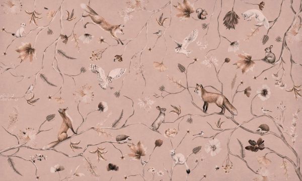 Dieses zarte Design bringt den Wald auf einem pudrigen Rosa zum Leben, das sich weich und warm anfühlt. Zwischen anmutigen Zweigen und raffinierten Blumen bewegen sich Waldbewohner wie Füchse, Wiesel, Igel, Eulen, Kaninchen und Eichhörnchen ruhig vorwärts. Alles ist in eleganten Erdtönen wie Braun, Creme, Karamell und Sand von Hand illustriert - subtil abgesetzt gegen das Rosa, was dem Ganzen eine träumerische, fast märchenhafte Atmosphäre verleiht. Die Blumen und Blätter sind in einem ruhigen Rhythmus verteilt, mit feinen Details, die zum Betrachten einladen, ohne zu dominieren. Das Farbschema ist perfekt ausbalanciert: warm, natürlich und harmonisch, was das Design freundlich erscheinen lässt und gleichzeitig stilvoll bleibt. Dieses Design passt hervorragend in ein romantisches skandinavisches oder klassisches Kinderzimmerinterieur, in dem sanfte Farben, natürliche Formen und Ruhe im Mittelpunkt stehen. Denken Sie an Möbel in Weiß oder hellem Holz, Stoffe aus Leinen oder Musselin und Accessoires in Pastellfarben wie Hellgrün, Beige oder helles Terrakotta. In einem Mädchenzimmer, Babyzimmer oder ruhigen Spielbereich vermittelt dieses Design ein Gefühl von Geborgenheit und Ruhe. Auch in Wartebereichen oder Leseecken mit einem sanften Ambiente kommt dieses Design wunderschön zur Geltung. Durch den pudrigen Rosa-Hintergrund erhält das Ganze eine feminine, aber nicht übermäßig süße Atmosphäre. Die Tiere sorgen für einen verspielten Kontrast und machen das Design interessant und lebendig - ein zeitloser Favorit für Jung und Alt.