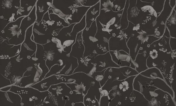Dieses raffinierte Design bringt die Stille des nächtlichen Waldes zum Leben, mit einem harmonischen Zusammenspiel von Tieren und Natur in gedämpften Farbtönen auf einem tiefen, mattschwarzen Hintergrund. Zwischen verzweigten Linien und subtilen Blumen sehen wir Füchse, Kaninchen, Wiesel, Igel, Eulen und kleine Singvögel, die fast gegen die dunkle Leinwand leuchten.