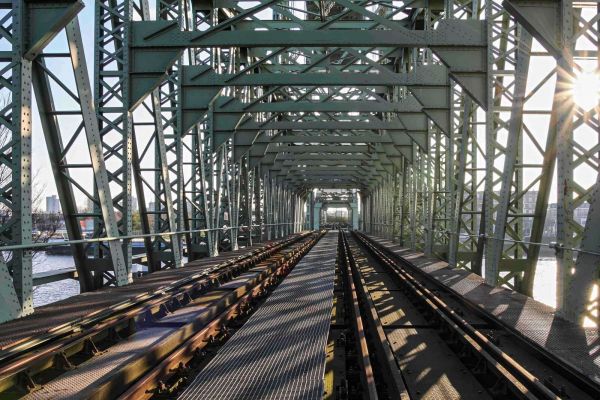 Ein beeindruckendes Bild der historischen Hefbrug in Rotterdam, in dem Stahlkonstruktionen und Gleise in einer symmetrischen Perspektive zusammenkommen. Die Sonnenstrahlen fallen spielerisch durch die metallischen Strukturen, wodurch ein dynamisches Spiel von Licht und Schatten entsteht. Die Tiefenwirkung und industriellen Details machen dies zu einem kraftvollen und zeitlosen Stadtbild.