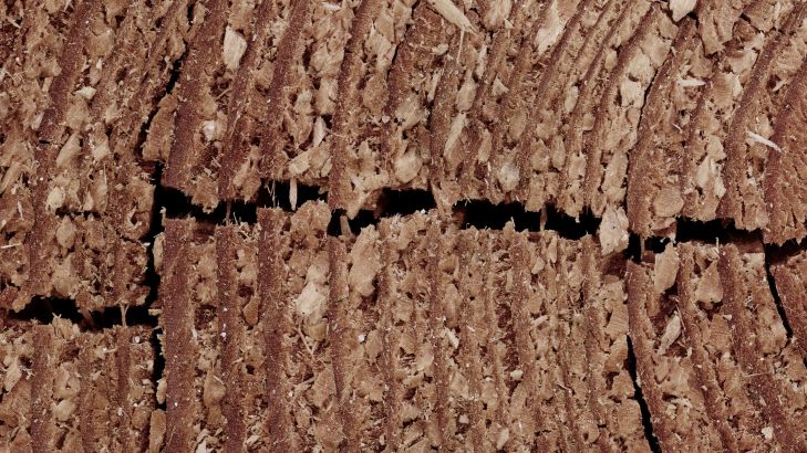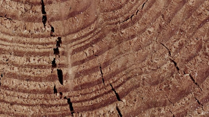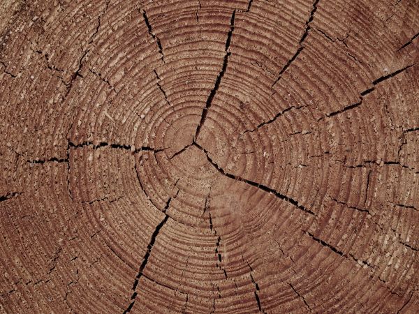 Nahaufnahme eines dunklen Baumstammes mit Jahresringen