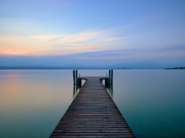 Schöner Holzsteg bei Sonnenuntergang. Diese Fototapete bringt sofort mehr Atmosphäre in den Raum.