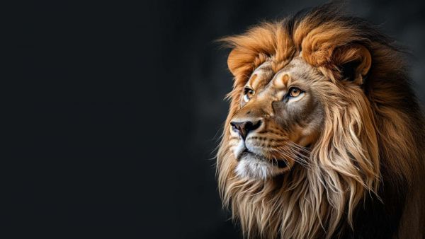 Dieser beeindruckende Löwe, festgehalten gegen einen dunklen Hintergrund, verkörpert eine ruhige, aber kraftvolle Präsenz.