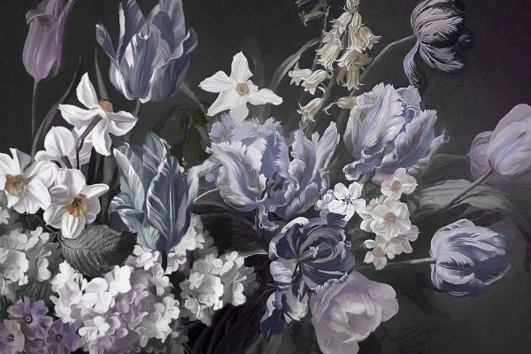 Ein elegantes und raffiniertes Blumenstillleben mit Tulpen, Narzissen und Blüten in blau-grauen und lila Tönen. Der dunkle Hintergrund sorgt für einen dramatischen Kontrast, wodurch die subtilen Pinselstriche und zarten Details besonders hervorstechen. Eine zeitlose und luxuriöse Komposition mit klassischem Flair.
