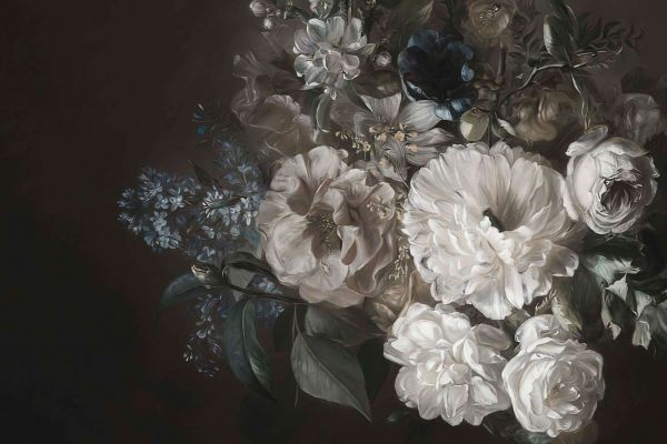 Dieses üppige Design erweckt die klassische Schönheit eines Blumenstilllebens zum Leben. Die raffinierten Rosen, Pfingstrosen und Blüten in sanften Creme- und Erdtönen kontrastieren wunderbar mit dem dunklen Hintergrund, während subtile Akzente von Blau und Grün dem Gesamtbild eine zusätzliche Dimension verleihen. Die detaillierten Pinselstriche und realistischen Texturen schaffen eine Atmosphäre, die an die Malerei der Barockzeit erinnert, in der Blumen als Symbole der Vergänglichkeit und Eleganz verewigt wurden. Dieses Design passt perfekt in ein klassisches, vintage oder luxuriöses Interieur. In Kombination mit tiefen Holzfarben, Samt und Messingakzenten entsteht eine warme und romantische Atmosphäre. In einem modernen Interieur kann dieses Design hingegen ein künstlerisches Statement setzen, insbesondere wenn es mit klaren Linien und minimalistischen Möbeln kombiniert wird. Auch in einem botanischen oder eklektisch-chicen Setting fügt dieses Design ein Gefühl von Raffinesse hinzu. Durch die reichen Farben und tiefen Kontraste ist dieses Design ideal für stimmungsvolle Räume wie ein elegantes Esszimmer, ein stilvolles Wohnzimmer oder ein schickes Schlafzimmer. Auch in einem Hotel, Restaurant oder einer Lounge kann es eine luxuriöse und klassische Ausstrahlung erzeugen, wodurch der Raum sofort eine zeitlose Anziehungskraft erhält. Um die Pracht dieses Designs zu verstärken, können Accessoires in Gold, antikem Silber oder dunklem Holz hinzugefügt werden. Stimmungsvolle Beleuchtung mit warmen Tönen sorgt dafür, dass die Blumen besonders zur Geltung kommen und der dramatische Hintergrund betont wird. Dieses Design ist eine zeitlose Hommage an klassische Blumenmalereien und bringt ein Gefühl von Luxus und Eleganz in jeden Raum.