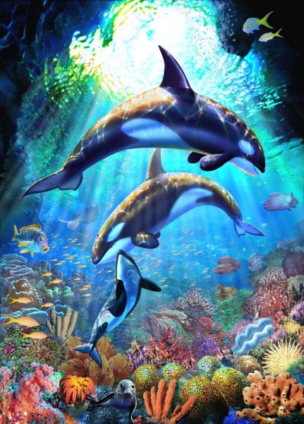 Ein faszinierendes Unterwasserlandschaft mit eleganten Orcas und bunten Korallenriffen, erleuchtet von strahlenden Sonnenstrahlen. Dieses Design kombiniert tiefblaue Töne mit lebhaften Farben des Meereslebens und schafft eine ruhige und bezaubernde Atmosphäre, die die Magie des Ozeans zum Leben erweckt.