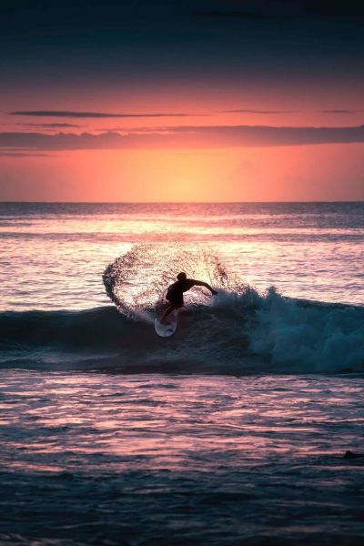 Ein Surfer-Silhouette, der stilvoll eine Welle bei Sonnenuntergang reitet. Der Himmel und das Meer sind in tiefes Rosa, Lila und Orange getaucht, während das spritzende Wasser im sanften Abendlicht leuchtet.