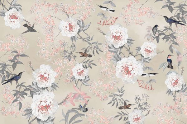 Eine raffinierte Komposition natürlicher Schönheit, in der Blumen, Vögel und botanische Elemente in harmonischer Balance dargestellt sind. Dezente Farben und detaillierte Muster sorgen für einen eleganten und zeitlosen Look, der jeden Raum verwandelt.