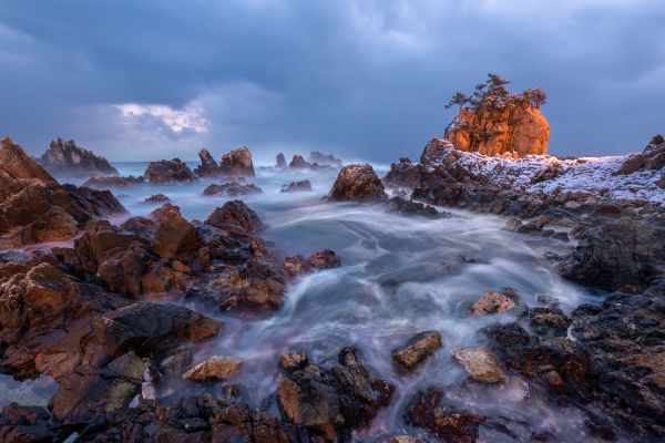 Wasser läuft zwischen den Felsen. Im Hintergrund ist ein Felsen zu sehen, durch den Bäume wachsen.