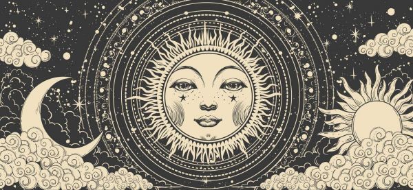 Ein kraftvolles, detailliertes himmlisches Szenario mit einer Personifikation der Sonne als Mittelpunkt – ein magisches und mystisches Kunstwerk voller Symbolik.