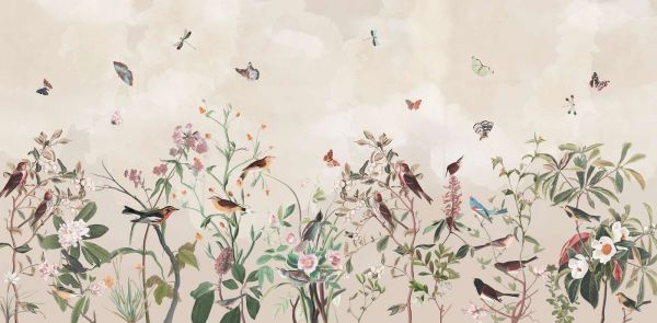 Detaillierte Designs mit einer raffinierten Mischung aus Vögeln, Schmetterlingen und Blumen auf sanften Farbhintergründen. Perfekt, um in jedem Innenraum eine ruhige und natürliche Atmosphäre zu schaffen.