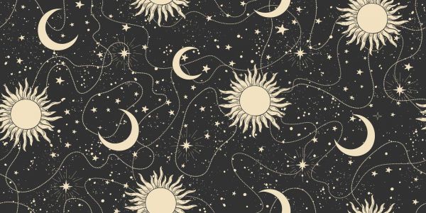 Ein elegantes kosmisches Muster mit wellenförmigen Perlenketten, mystischen Sonnen, Sichelmonden und funkelnden Sternen vor einem tiefschwarzen Hintergrund. Zeitlos und traumhaft.