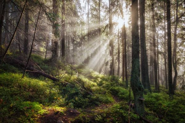Der Wald selbst ist üppig und dicht, mit einer dicken Schicht aus Farnen, Sträuchern und Moos, die eine weiche, einladende Decke über dem Waldboden bildet. Die Bäume, mit ihren hohen, robusten Stämmen, stehen still und majestätisch da, als würden sie den ruhigen Moment des Sonnenaufgangs feiern. Die Kombination aus dem tiefen Grün der Vegetation und den warmen goldenen Tönen des Sonnenlichts erzeugt eine harmonische und beruhigende Atmosphäre, die perfekt für jeden Raum ist, in dem ein Gefühl von Natur und Gelassenheit gewünscht wird.