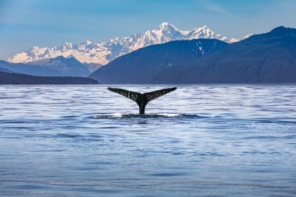 Ein tauchender Wal mit schneebedeckten Bergen im Hintergrund.