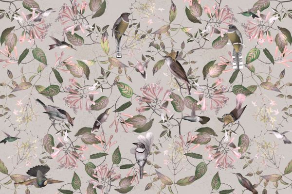 Ein verspieltes und elegantes Design mit bunten Vögeln zwischen schlanken Blättern und zarten Blumen, perfekt, um einen Raum mit einem Hauch von natürlicher Harmonie und Raffinesse zu füllen.