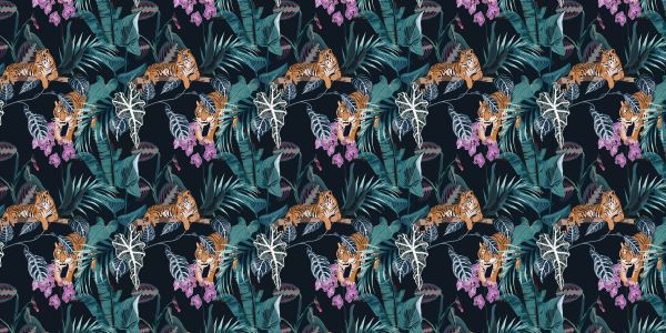 Tropisches Muster von Tigern, Blättern und Blumen auf einem schwarzen Hintergrund.