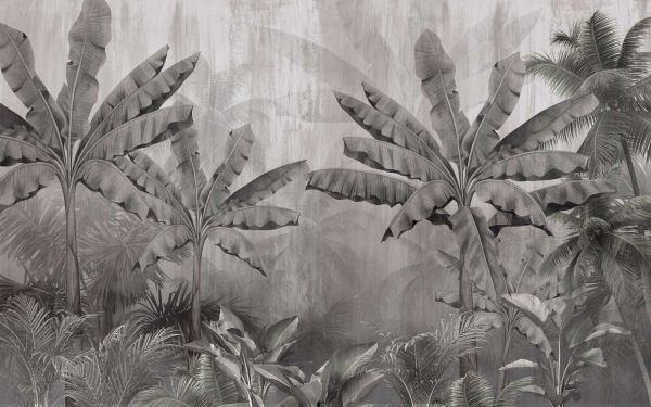 Ein stimmungsvolles und zurückhaltendes tropisches Szenario mit großen Bananenblättern und Palmen in sanften Grautönen. Der subtile Nebel und der verwitterte Effekt verleihen eine traumhafte und beruhigende Ausstrahlung. Dieses Design fängt die serenen Schönheiten eines tropischen Morgens ein, in dem die Natur langsam im Nebel erwacht.
