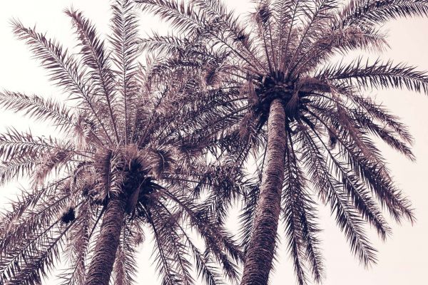 Hoch aufragende Palmen mit anmutigen Blättern, aus einer niedrigen Perspektive fotografiert. Die warmen Farbtöne und subtile Leuchtkraft verleihen dem Bild eine träumerische, sommerliche Atmosphäre.