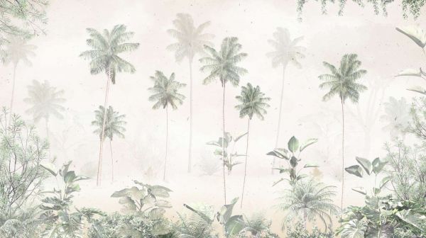 Ein zartes Palett aus pastellgrünen und weißen Tönen verleiht dieser Abbildung einer tropischen Landschaft eine träumerische Ausstrahlung. Der leichte Nebel, der zwischen den Palmen hängt, verstärkt die serene und unberühr te Atmosphäre dieses friedlichen Refugiums.