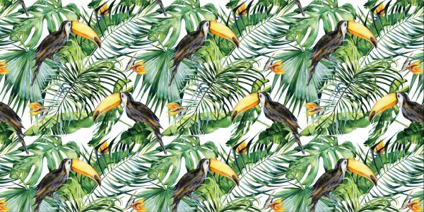 Aquarell-Illustration eines Tukans zwischen tropischen Blättern.