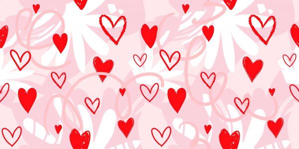 Ein fröhliches Muster voller roter und rosa Herzen, verspielter Linien und zarter, blütenartiger Formen vor einem rosafarbenen Hintergrund. Die lebendigen Farben und der luftige Stil schaffen eine romantische und heitere Atmosphäre.
