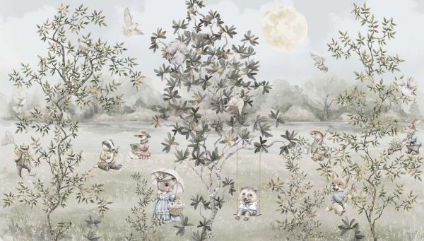 Diese herzerwärmende Illustration zeigt eine idyllische Szene voller charmanter Waldbewohner, die gemeinsam einen Sommertag am Ufer eines ruhigen Sees verbringen. Die Szene ist reich an Details und voller Leben: Ein Igel schwingt an einem Ast, ein Dachs spielt Mandoline, ein Frosch jagt mit einem Schmetterlingsnetz, und Kaninchen kümmern sich um ihren Garten oder lesen im Gras. Jedes Tier ist in nostalgische, ländliche Kleidung gekleidet, was zur vintage und rustikalen Atmosphäre beiträgt. Die Farbgebung besteht aus sanften Grüntönen, warmem Beige, verwaschenem Blau und hellbraun. Diese natürlichen und subtilen Farben sorgen für eine ruhige, freundliche Ausstrahlung, die nahtlos zu skandinavischen oder ländlichen Interieurs passt. Denken Sie an Holzmöbel, leichte Leinenstoffe und Rattanaccessoires, um diese Atmosphäre noch mehr zur Geltung zu bringen. Durch die reiche Detailfülle und den märchenhaften Charakter ist diese Illustration perfekt für Kinderzimmer, Spielzimmer oder sogar eine Leseecke. In Kombination mit Bücherregalen aus Naturholz, geflochtenen Aufbewahrungskörben und gemütlichen Kissen wird der Raum zu einem einladenden Ort, an dem Kinder in Geschichten und Spielen versinken können. Die Bäume, Vögel, Blumen und der plätschernde Fluss im Hintergrund vermitteln ein Gefühl von Ruhe und Verbundenheit mit der Natur. Die Szene strahlt ein nostalgisches und fast zeitloses Gefühl aus – als blätterte man durch ein Kinderbuch. Gleichzeitig regen die Charaktere und ihre Aktivitäten die Fantasie an und fördern kreatives Spiel.