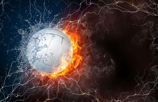 3D-Bild eines Volleyballs mit Wasser und Feuer.