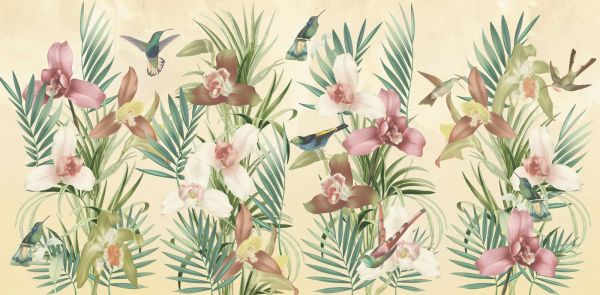 Elegante Designs mit üppigen Blumen, Kolibris und anmutigen Blättern, angereichert mit sanften Farbschemata. Diese Muster verleihen jedem Raum eine raffinierte und beruhigende natürliche Schönheit.