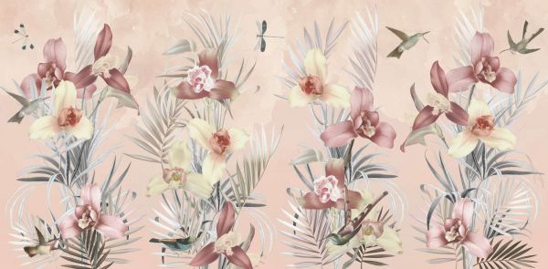 Elegante Designs mit üppigen Blumen, Kolibris und anmutigen Blättern, angereichert mit sanften Farbschemata. Diese Muster verleihen jedem Raum eine raffinierte und beruhigende natürliche Schönheit.