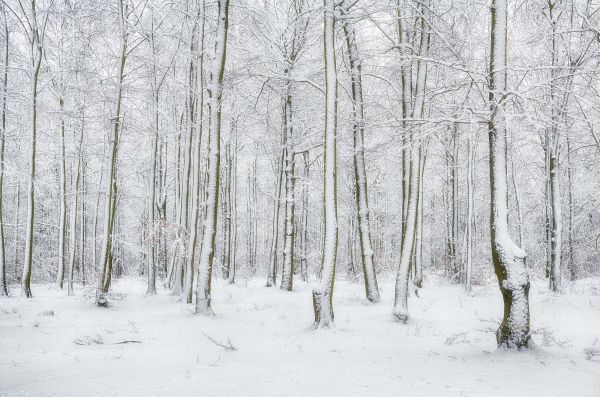 Ein Winterwald mit dünnen Bäumen, die komplett mit weißem Schnee bedeckt sind.