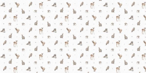 Leichtes und raffiniertes Muster mit Waldtieren wie Hirschen, Igeln, Kaninchen, Eulen und Waschbären auf einem winterweißen Hintergrund. Die Illustrationen in natürlichen Tönen sorgen für ein ruhiges und elegantes Erscheinungsbild.