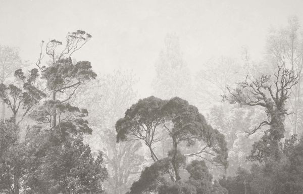 Waldlandschaft auf schwarz-weißer Fototapete. Diese Tapete eignet sich zum Beispiel perfekt für das Wohnzimmer.