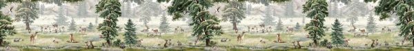 Eine stimmungsvolle Berglandschaft mit Kiefern, Hirschen, Füchsen, Dachsen und Kaninchen. In sanften Grüntönen und mit viel Tiefe strahlt das Ganze Ruhe und Naturerlebnis aus.