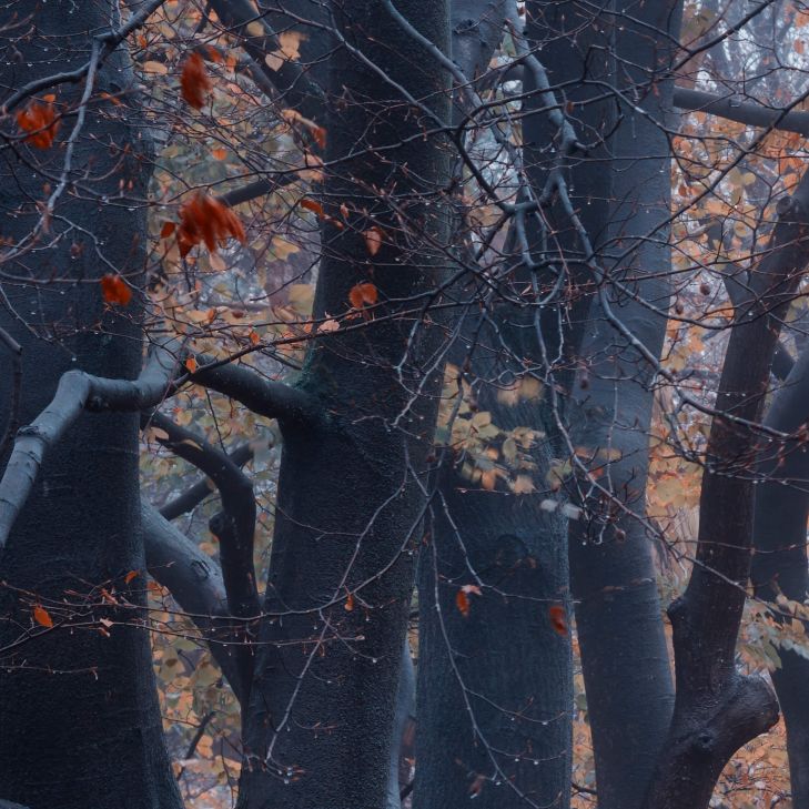 Waldweg mit Blättern an einem nebligen Morgen. Kombinieren Sie dies in Ihrem Haus.
