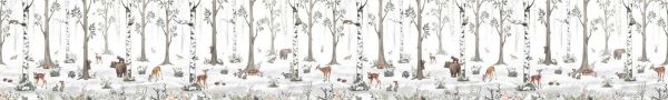 Diese beruhigende Illustration zeigt einen stillen Birkenwald voller tierischen Lebens, dargestellt in sanften, natürlichen Tönen. Zwischen den schlanken weißgrauen Baumstämmen bewegen sich neugierige Hirsche, spielende Bärenjungen, scharrende Dachse und ruhende Füchse. Auch Eichhörnchen, Kaninchen, Vögel und eine Eule bringen Leben in diese ruhige Waldlandschaft. Unten sorgen wilde Blumen, Farnblätter und Gräser für einen subtilen Farbakzent in sanften Pastelltönen. Die Farbgebung besteht vorwiegend aus hellen Grautönen, Grün, Hellbraun und Beige, wodurch die Gesamtheit luftig und zeitlos wirkt. Diese Illustration ist ideal für ein Kinderzimmer, Babyzimmer oder einen Raum, in dem Ruhe und Geborgenheit im Zentrum stehen. Das Design bringt eine ruhige Naturerfahrung nach innen, ohne zu dominieren. Kombinieren Sie es mit Möbeln aus Naturholz, Textilien in Creme, Hellgrün oder verwaschenem Rosa, und Accessoires wie Filztiere, Körbe oder Äste. Auch geeignet für eine Spiel- oder Leseecke, in der Kinder sich von der Magie des Waldes umgeben fühlen können. Der Illustrationsstil ist fein und harmonisch, mit großer Detailgenauigkeit und einer schönen Balance zwischen offener Fläche und gefüllten Bereichen. Die Wiederholung der Bäume verleiht Rhythmus und Struktur, während die Variation der Tiere Dynamik und Überraschung schafft. Ein wunderschönes Design, das Ruhe und Verwunderung hervorrufen – perfekt für jeden, der die Natur in ihrer sanftesten Form liebt.