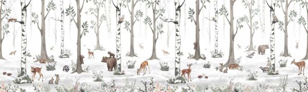 Diese charmante Waldillustration erweckt die Ruhe und Magie eines Birkenwaldes zum Leben. Zwischen den schlanken Stämmen von Birkenbäumen spielen Hirsche, Bären, Füchse, Eichhörnchen, Dachsen, Eulen und Kaninchen in einer friedlichen, natürlichen Umgebung. Der Untergrund ist hell und weißlich, was dem Ganzen eine frische und fast märchenhafte Ausstrahlung verleiht. Die Farben sind sanft und natürlich: viel Graugrün, Braun, Beige und Akzente von Moosgrün und zartem Rosa in den Blümchen auf dem Waldboden.
