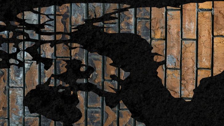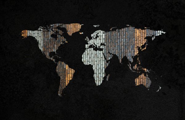 Weltkarte mit vertikalen farbigen Steinen. Der schwarze Hintergrund hebt die Weltkarte hervor.