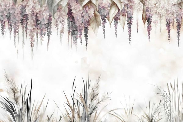 Ein raffiniertes Design, in dem hängende Blauregenblüten sanft in eine Landschaft aus anmutigem Wildgras übergehen. Die subtilen Nuancen von Lila, Sepia und Grau im Aquarellstil erzeugen eine traumhafte und beruhigende Ausstrahlung. Die zarten Farbverläufe und das sanfte Licht verleihen diesem Design eine elegante, natürliche Atmosphäre.