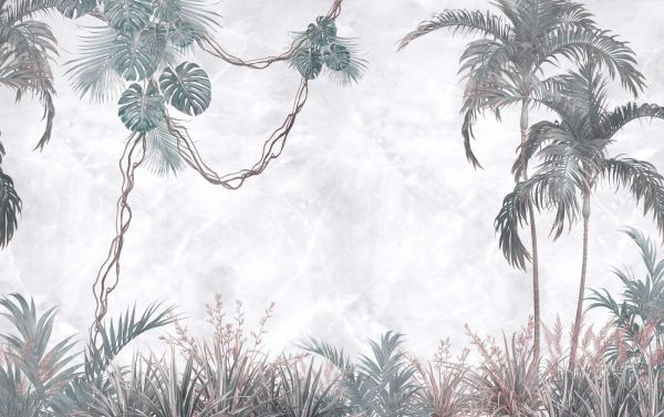 Ein raffiniertes tropisches Design mit eleganten Palmen, üppigem Grün und hängenden Lianen, ausgeführt in sanften Pastell- und graugrünen Farbtönen. Der helle, marmorartige Hintergrund verleiht eine frische und traumhafte Ausstrahlung. Dieses Design strahlt Ruhe und Eleganz aus, perfekt für eine serenen und natürlichen Atmosphäre.
