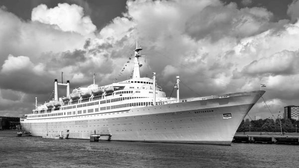 Ein majestätisches Passagiersschiff liegt unter einem beeindruckenden Wolkenhimmel vor Anker. Der Schwarz-Weiß-Stil und das Spiel von Licht und Schatten verleihen diesem Design eine zeitlose, nostalgische Ausstrahlung, die perfekt in ein stilvolles und klassisches Interieur passt.