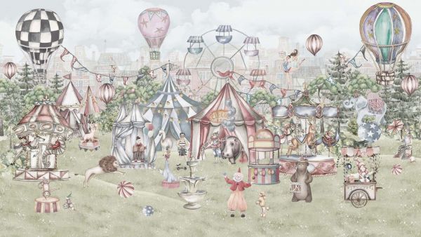 Willkommen auf einem bezaubernden Jahrmarkt, wo Fantasie und Nostalgie in einem Meer aus fröhlichen Details und sanften Farben zusammentreffen. In der Mitte stehen bunte Zirkuszelte, wo ein Elefant, ein Löwe und fröhliche Künstler die Show stehlen. Kinder schweben in Wellenfliegern, ein Karussell dreht sich voller Tierfiguren und ein Riesenrad ragt über alles hinaus. Clowns, Ballons, Drachen und Zuckerwattenwagen bringen eine festliche Atmosphäre, die an einen klassischen Sommerjahrmarkt erinnert, voller Staunen und Freude. Die Illustration ist aus sanften Pastellfarben wie Hellrosa, Babyblau, Cremeweiß und Hellrot aufgebaut, ergänzt durch natürliche Grüntöne und Holzakzente. Diese Farben machen das Design perfekt für eine verspielte und luftige Atmosphäre in Kinderzimmern oder Spielbereichen. Es kombiniert wunderbar mit weißen oder hölzernen Möbeln, dekorativen Fähnchen, Stoffgirlanden und Retro-Spielzeug. Das Bild strahlt Bewegung und Fantasie aus, bleibt aber gleichzeitig ruhig durch die harmonische Komposition. Überall in der Illustration sind kleine Szenen zu entdecken – ein Affe auf einem Einrad, ein Bär bei einem Zuckerwattenwagen, tanzende Kaninchen – wodurch Kinder immer wieder neue Details sehen. Das Design regt zum Spielen, Geschichtenerzählen und zur Kreativität an. Ob es sich um ein Themenzimmer mit Zirkuselementen, eine gemütliche Spielecke oder eine Wand voller Erlebnisse handelt: Diese Illustration bringt Atmosphäre, Farbe und ein zeitloses Gefühl von Freude ins Haus. Sie ist fröhlich, ohne aufdringlich zu sein, und perfekt im Gleichgewicht für sowohl Jungen als auch Mädchen.