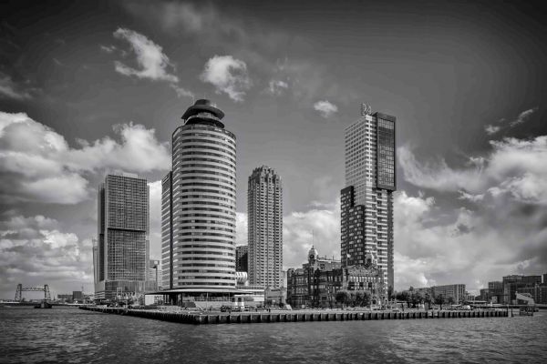 Eine kraftvolle Schwarz-Weiß-Komposition der Skyline von Rotterdam, in der moderne Architektur und historische Gebäude aufeinandertreffen. Der dramatische Himmel und die Reflexionen auf dem Wasser verstärken die Tiefe und Dynamik des Bildes. Die Mischung aus klaren Linien und klassischen Details schafft eine zeitlose und beeindruckende Stadtansicht.